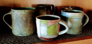 A collection of Veronica Watkins handmade ceramic coffee mugs.